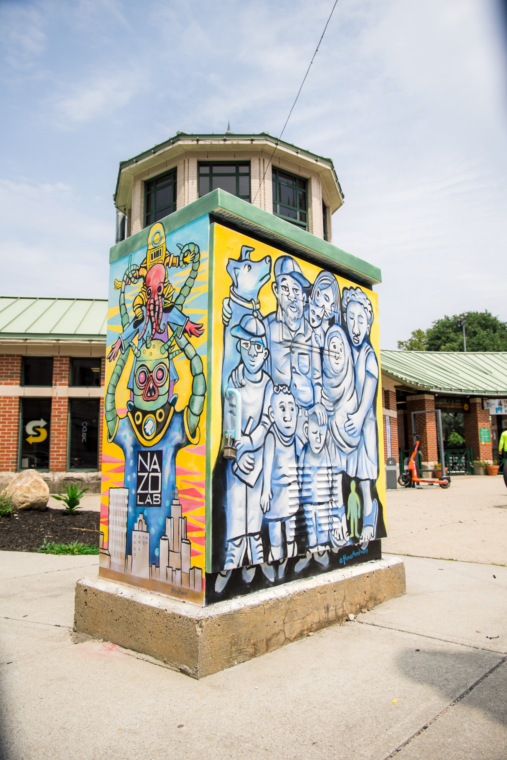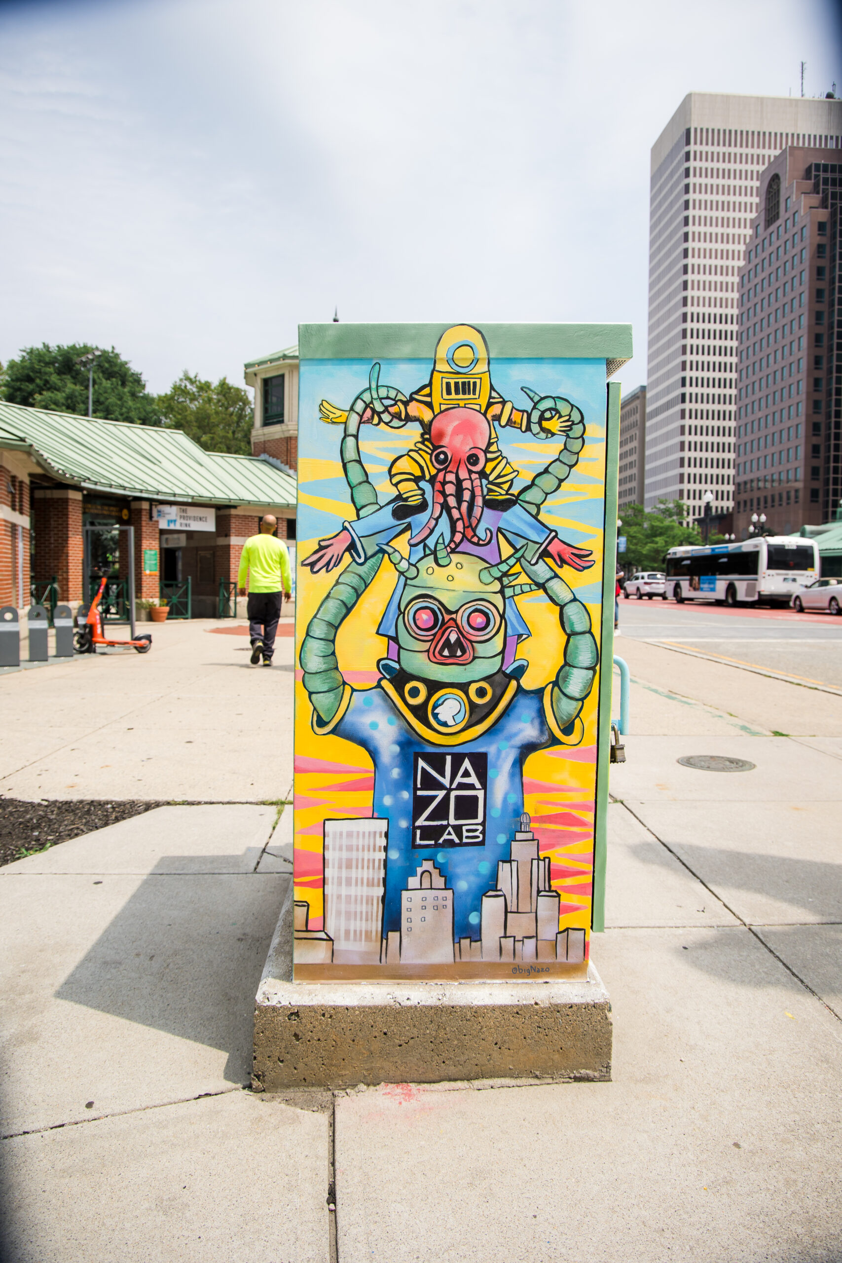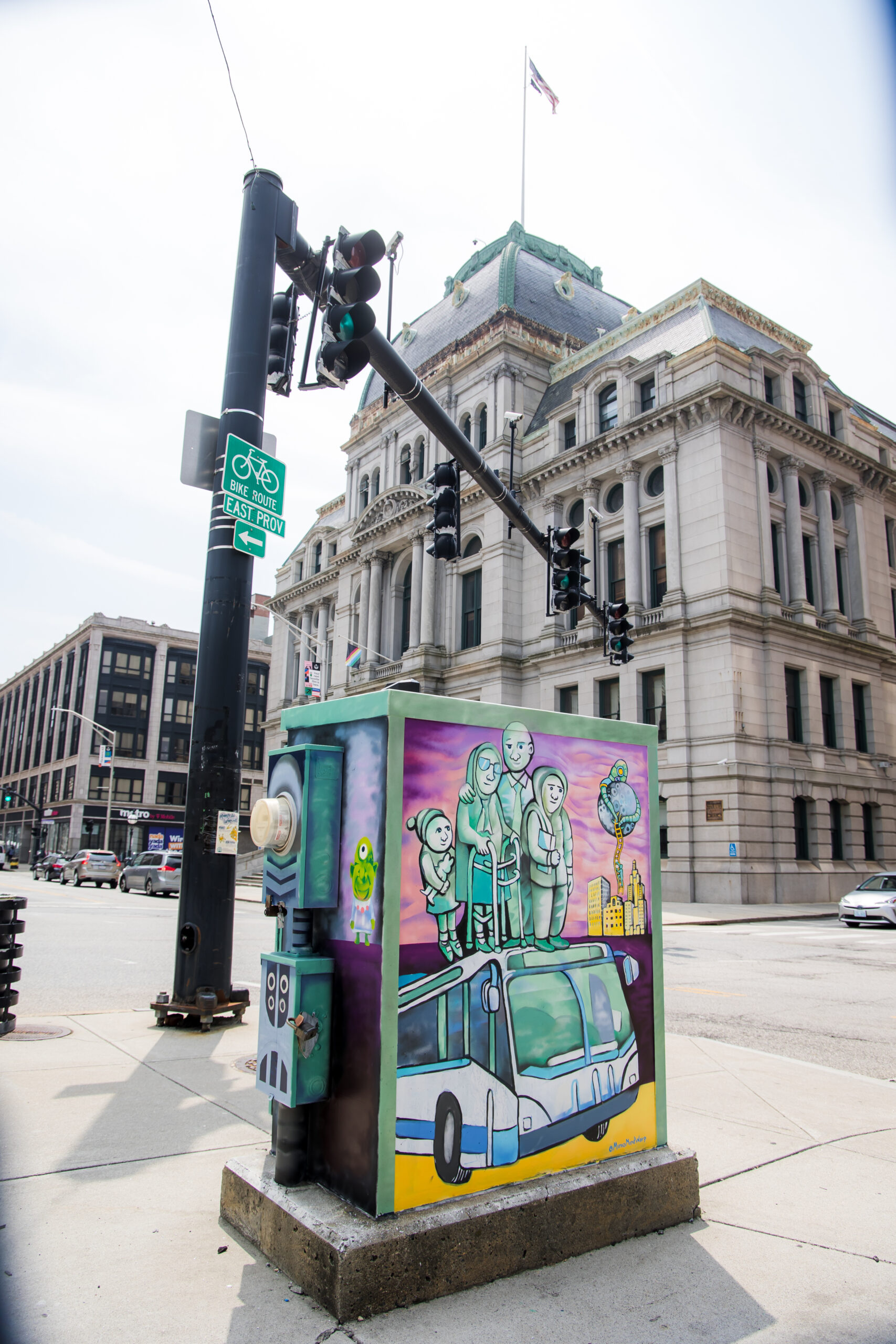 It’s an honor to have painted a site specific Utility Box mural in a part of Downtown that I have significant connection to. I’ve performed and created artwork in the Kennedy Plaza location for decades and , a few years ago, operated an open door studio space inside the Bus Station Building (called the “Space Transformation Station” ) which had positive impact on the transit riding community.
